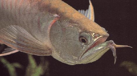 С таким ртом меню рыбы определяется однозначно. Рот похож на откидную дверцу - он открывается, заглатывает сверчка или рыбу и захлопывается. Арована, как примитивная рыба, не имеет таких зубов, как пиранья, поэтому она заглатывает добычу