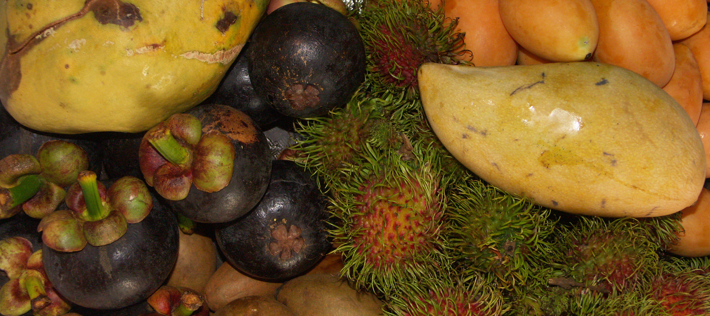| Garcinia mangostana | Mangosteen | manggis (Ins, Mal); mankhud (Lao); mingut (Bur); mang-gustan (Phi); mangkhut (Tha); cay mang cut (Vie) | Aug-Oct until Nov |